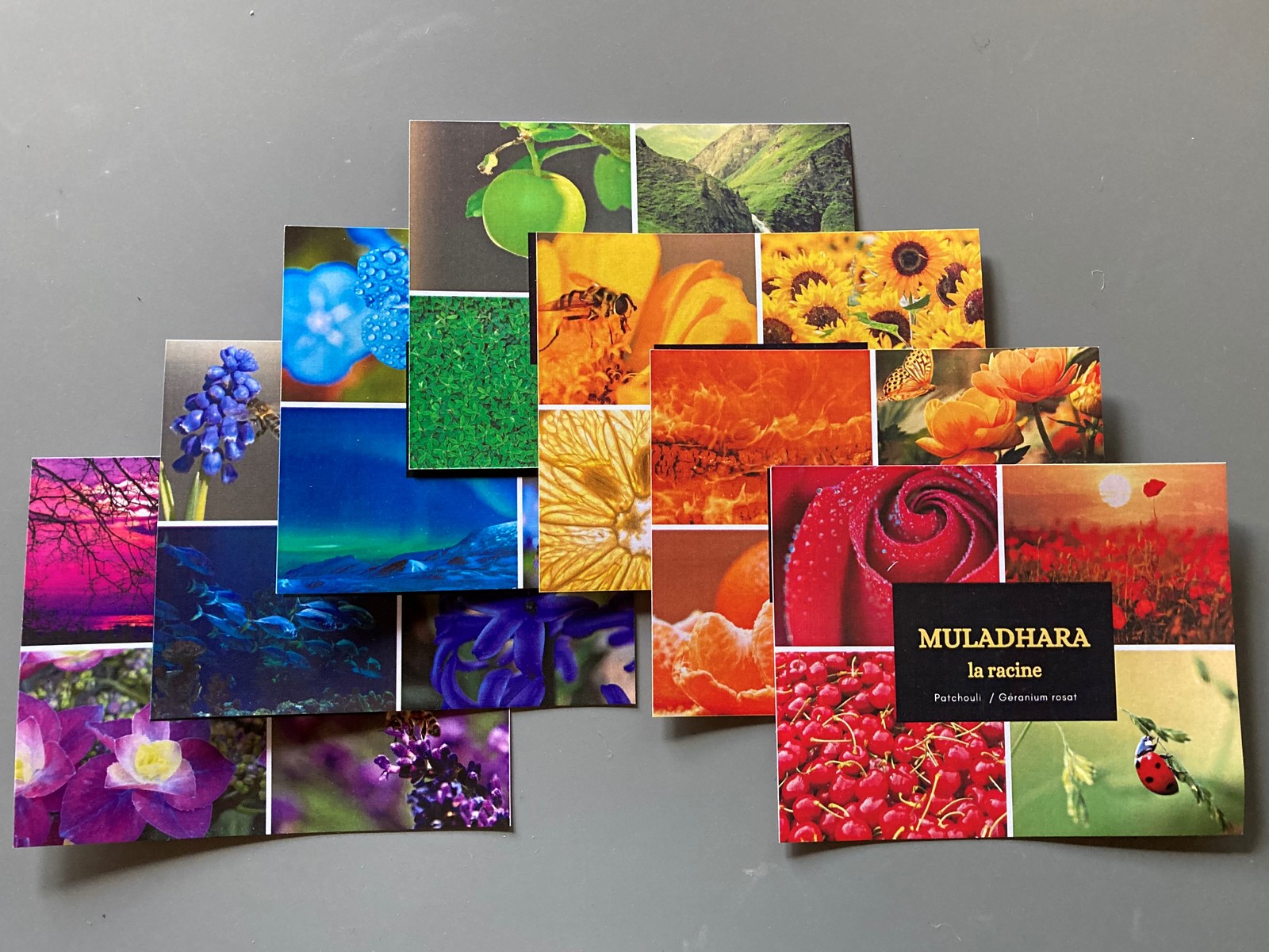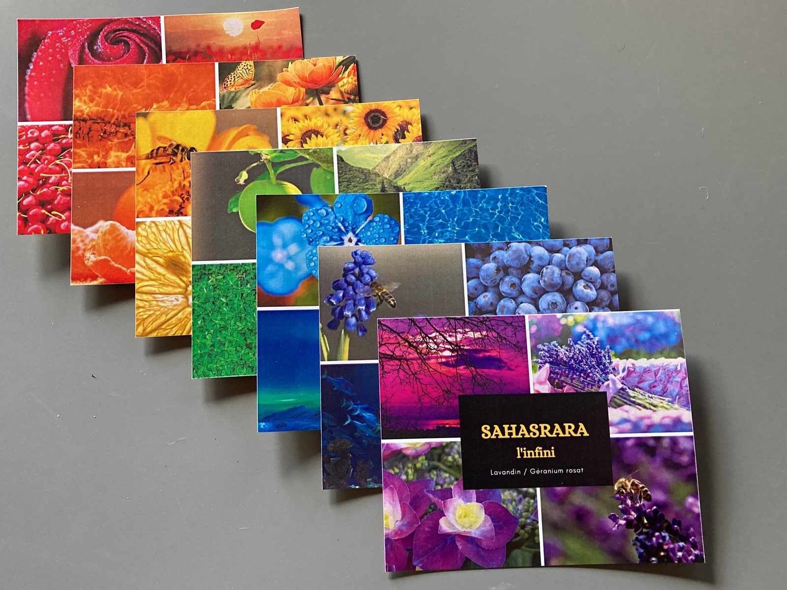 Elles représentent chacun des 7 chakras, par son nom, sa couleur, mais également l'harmonie parfum/couleur que j'ai choisie.