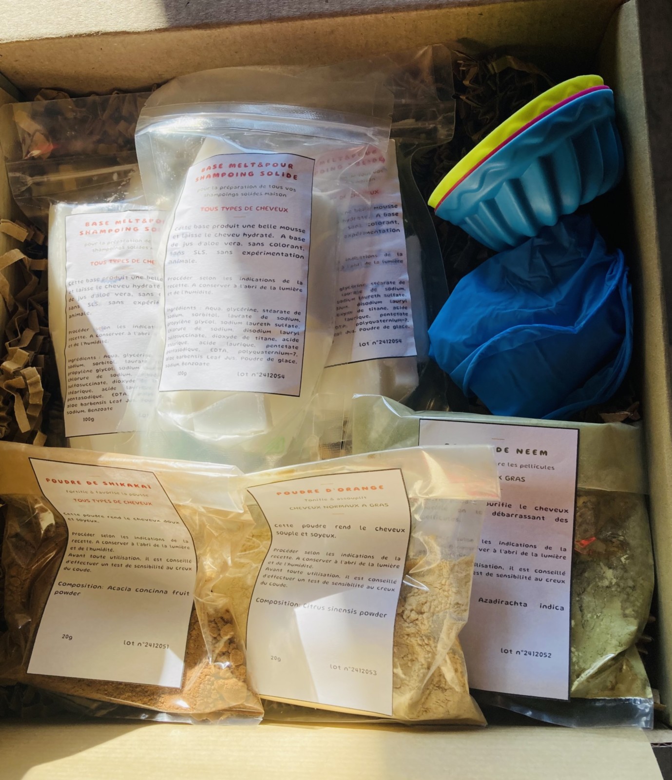 Avec cette box passion tu vas pouvoir réaliser jusqu'à 6 shampoings solides de 50 gr environ en utilisant la base Melt&Pour à l'aloe vera fournie ainsi que les poudres (neem, orange et shikakaï).